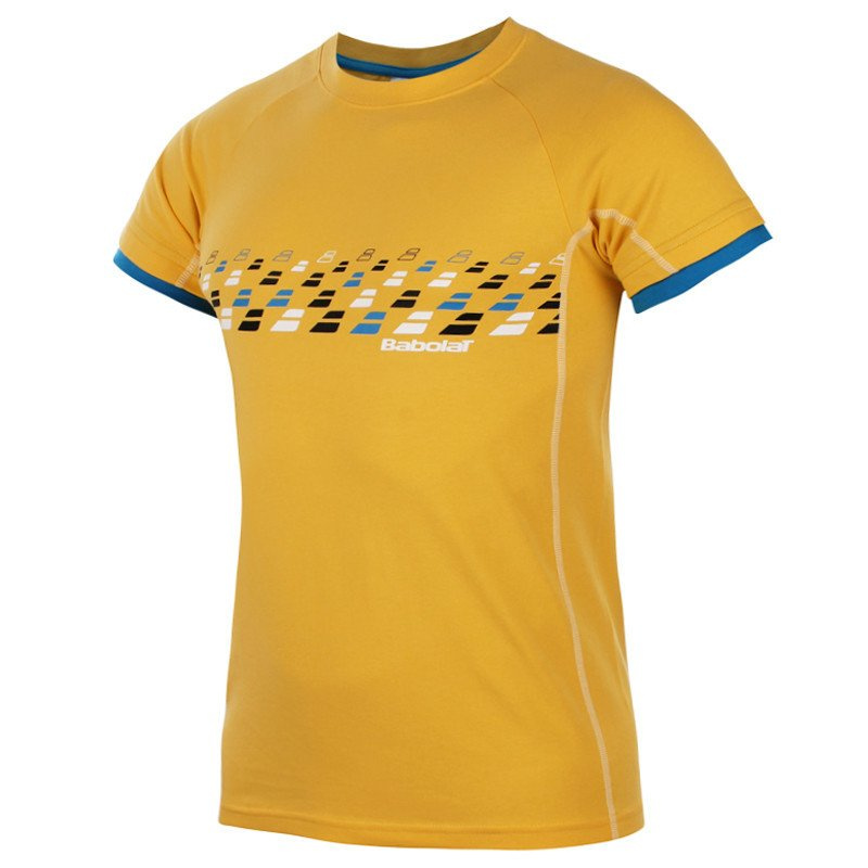 logo babolat, taśma usztywniająca przy kołnierzu, nadruk graficzny, rękawy wykończone materiałem w kontrastowym kolorze |